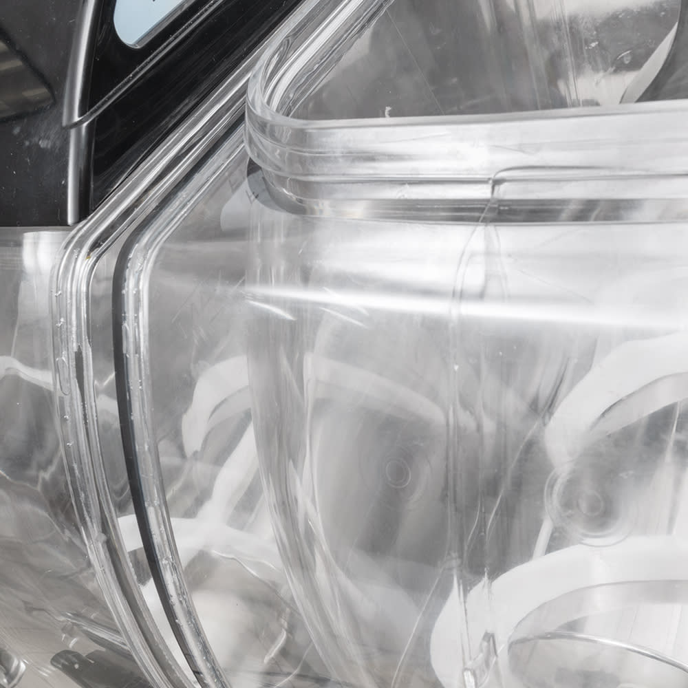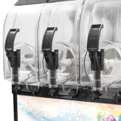 The Crathco I-PRO 3M frozen drink machine comes with three 2.9-gallon bowls, which are insulated to keep product cold and transparent to increase product visibility. Because the lids can be locked, unauthorized users are prevented from tampering with the product, and if the lids are lifted, a safety mechanism halts operation. Its refrigeration system uses R404A refrigerant to chill contents, and it is equipped with mechanical controls and a timer. Clearance of 8 inches is required on all sides of the unit to ensure proper operation, while its black exterior fits into most applications.