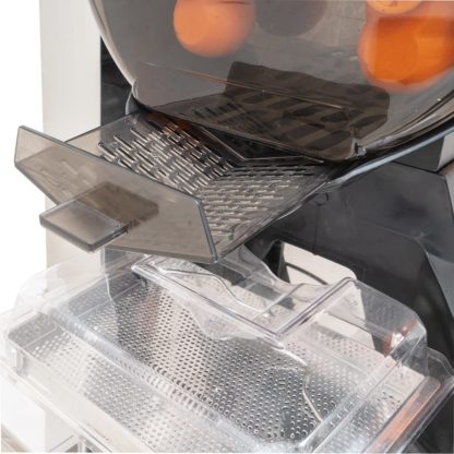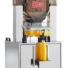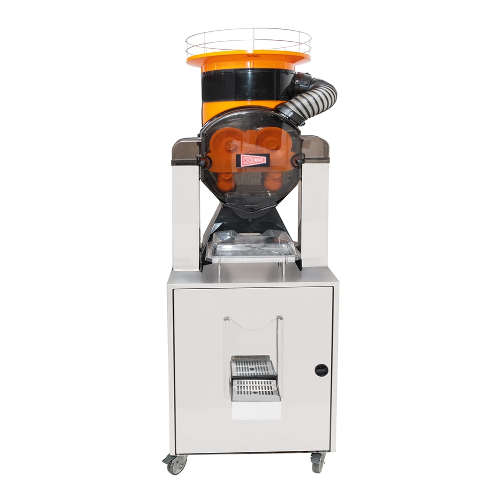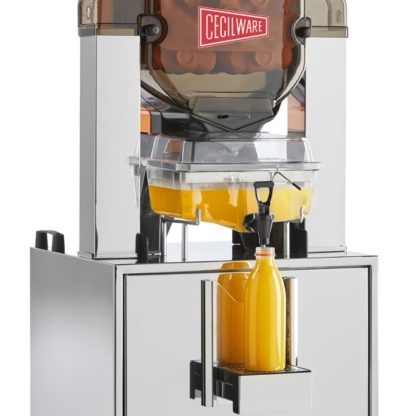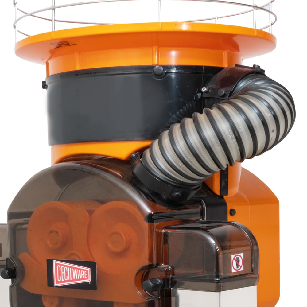 The Cecilware JX45AF juice machine can dispense as much as 114 ounces of freshly-squeezed orange juice per minute and features a self-serve faucet that allows guests to fill their own glass. This machine extracts virtually all of the juice from an orange without any of the peel or bitter peel oil. It can handle oranges as large as 3.2 inches in diameter. The juice machine makes use of an automatic carousel-style feeder that feeds oranges to the juicer from a large hopper. Micro-serrated slicer blades quickly and efficiently slice through thick peels. The machine is easy to disassemble without tools for cleaning, and many of the components can be conveniently cleaned and sanitized in a dishwasher.