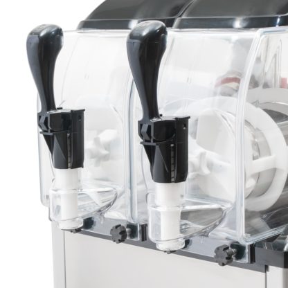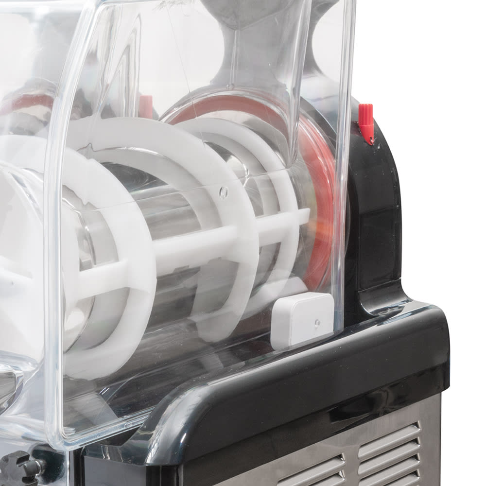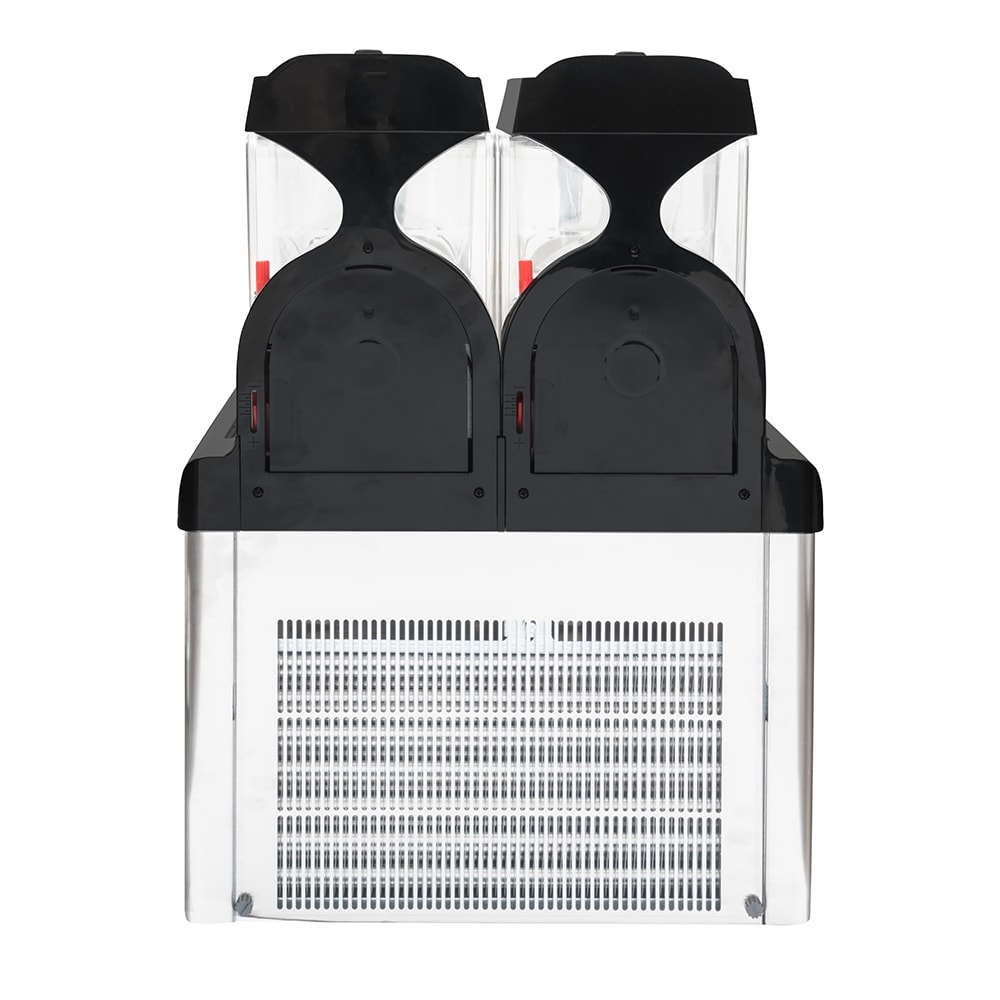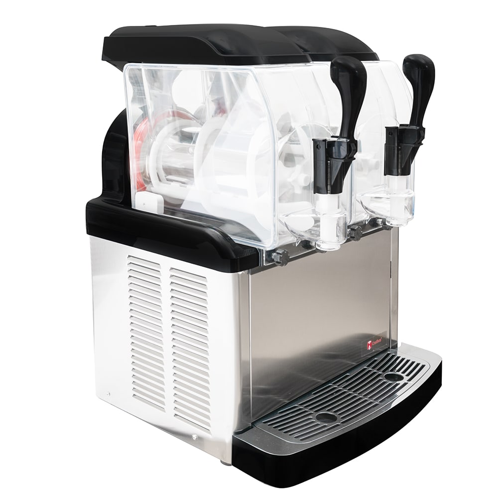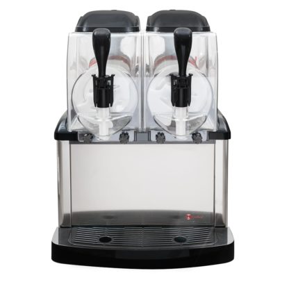 Designed for restaurants, coffee shops, bars, and hotels, the Crathco SP-2 frozen drink machine can be used to mix and serve frozen coffees and cocktails or ice cream, sherbets, and other creamy desserts. Product can be added with a ready-to-use product base, or a dried base with the addition of milk or water. Because the unit has two 1.3-gallon-capacity bowls, it can be used for different flavors. Its bowls are transparent to show off the drink and have insulation that maintains product temperatures.