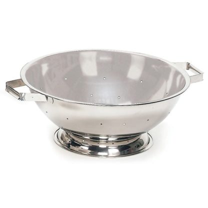 A versatile addition to both home and commercial kitchens, the Crestware COL13 Stainless Steel Footed Colander 13 Qt. is perfect for draining and cooling pasta and rinsing fresh produce. This colander features meticulously placed perforations for thorough draining while its durable stainless steel construction delivers superior performance and durability. Designed with convenience in mind, this colander has a footed base for free-standing draining and two sturdy handles for a comfortable grip.