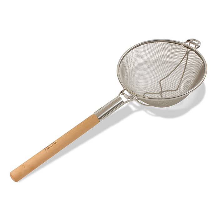 Built with a wooden handle, this strainer provides a comfortable grip while its stainless steel construction allows it to endure heavy duty use.
