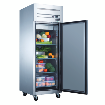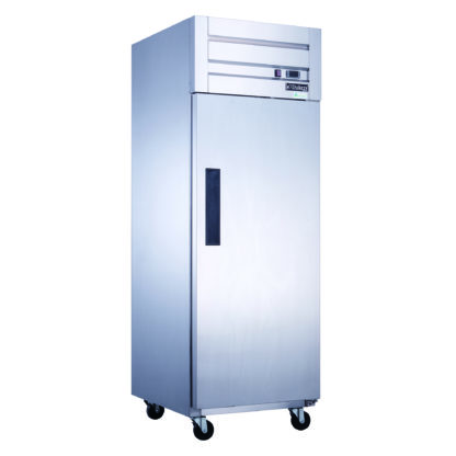 The Dukers D28AR reach-in commercial refrigerator is designed to suit the needs of any business who needs optimal performance without sacrificing design. A single door is accented with high-quality brushed stainless steel for both the interior and exterior to fit a variety of decors. Recessed door handles allow for clean styling and better ergonomics. The heavy-duty 1/5 HP compressor is top mounted for excellent efficiency and better cooling. Digital controls fine-tune the desired interior temperature. Self-closing doors free up your hands for added convenience and ease of use. Auto-defrosting provides lower energy costs and colder temperatures. Four shelves can be adjusted or removed for flexibility and maintenance. Easily move and position with four swivel casters.