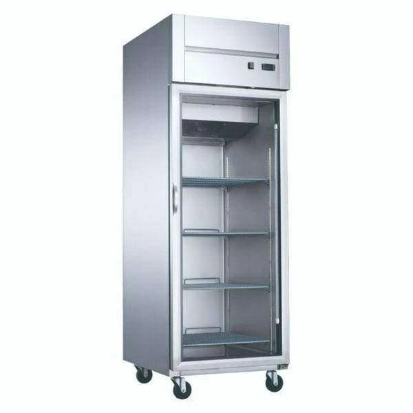 The Dukers D28AR-GS1 reach-in commercial refrigerator is designed to suit the needs of any business who needs optimal performance without sacrificing design. A single glass door is accented with high-quality brushed stainless steel for both the interior and exterior to fit a variety of decors. The heavy-duty 1/5 HP compressor is top mounted for excellent efficiency and better cooling. Digital controls fine-tune the desired interior temperature. Self-closing doors free up your hands for added convenience and ease of use. Auto-defrosting provides lower energy costs and colder temperatures. Four shelves can be adjusted or removed for flexibility and maintenance. Easily move and position with four swivel casters.