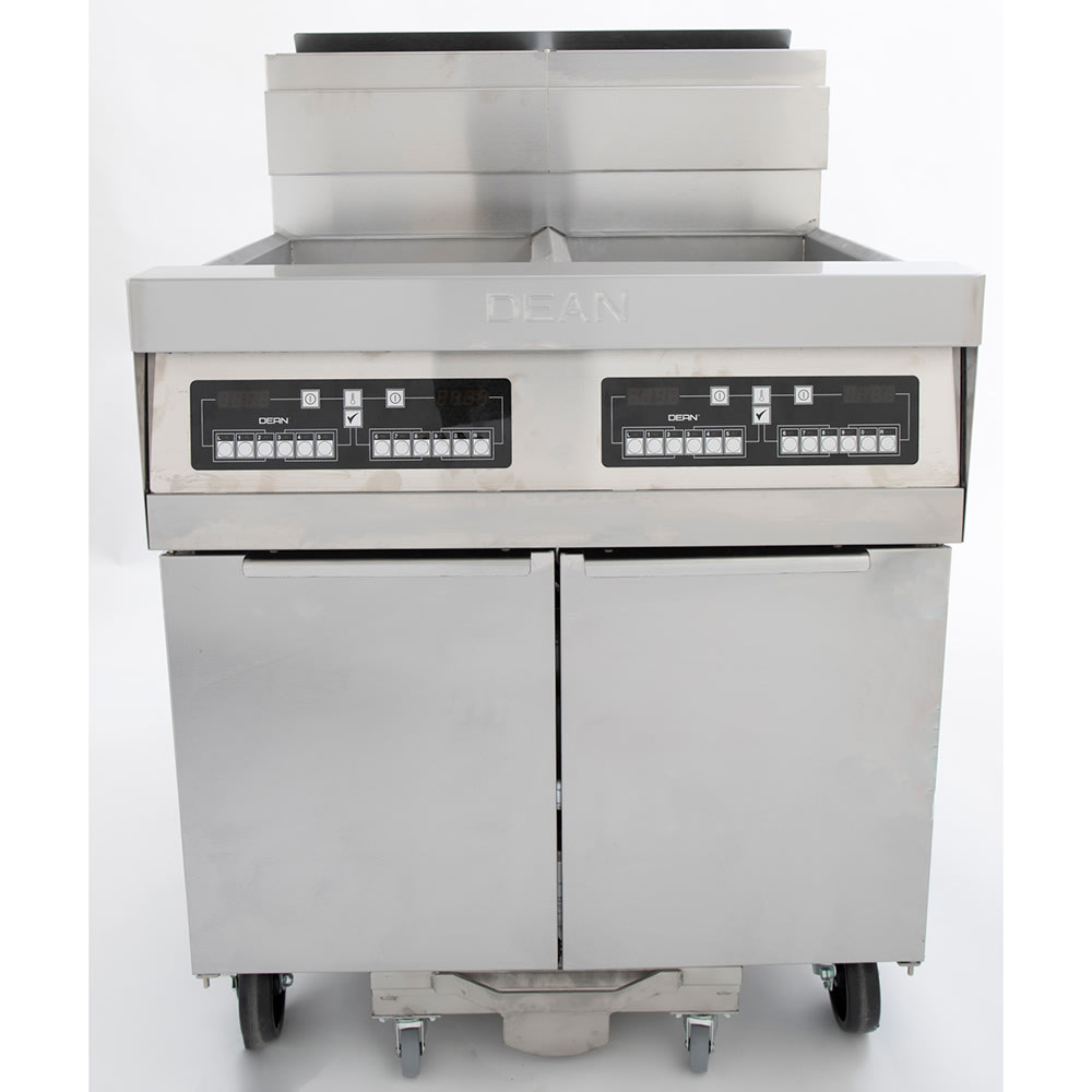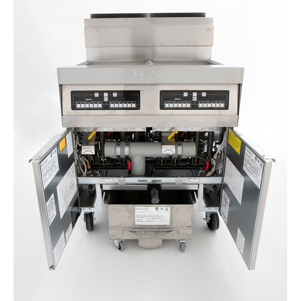 A filtration system built into the Dean 2FPRG50T gas fryer’s battery increases filtering frequency. Its gravity-draining mechanism is equipped with a 3-inch drain line that releases oil freely for continuous filtering, and it’s less likely to clog because it uses a 4-GPM pump. To minimize operation lags, it filters a frypot’s oil in 5 minutes and can function while another frypot is in use. Both the filter and unit are furnished with casters that streamline maintenance and cleaning; overall, this stainless steel unit measures 31 inches wide by 303/4 inches deep by 45 inches high.