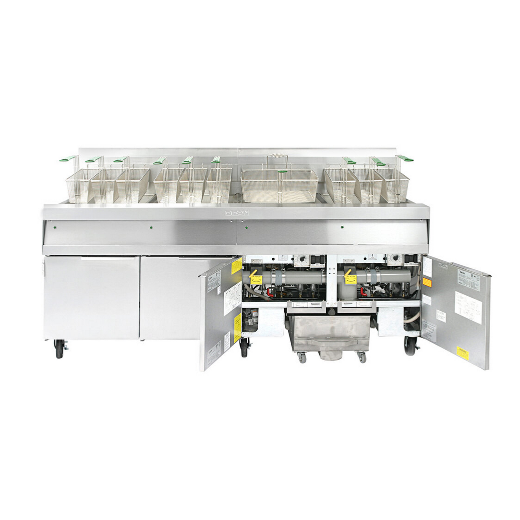 Decathlon Performance Fryer Battery, gas, (4) 75 lb. capacity each, built in filtration, thermo tube-type design, thermatron controller, automatic melt cycle, boil-out temperature control, includes: rack-type basket support, basket hanger & twin baskets, stainless steel frypot, front, door & cabinet sides, 6″ adjustable steel legs, 600,000 BTU, NSF Listed, cCSAus, CSA Star, CSA Flame