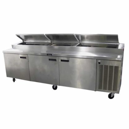 Refrigerated Pizza Table, three-section, 114″, 30.9 cubic feet, (14) 1/3 pan capacity, (3) shelves, (3) 32″ doors, 18 gauge stainless steel top, refrigerated pan rail, stainless steel ends, 6″ casters, side-mounted refrigeration system, R290 Hydrocarbon refrigerant, (2) 1/5 HP, cUL, UL, NSF