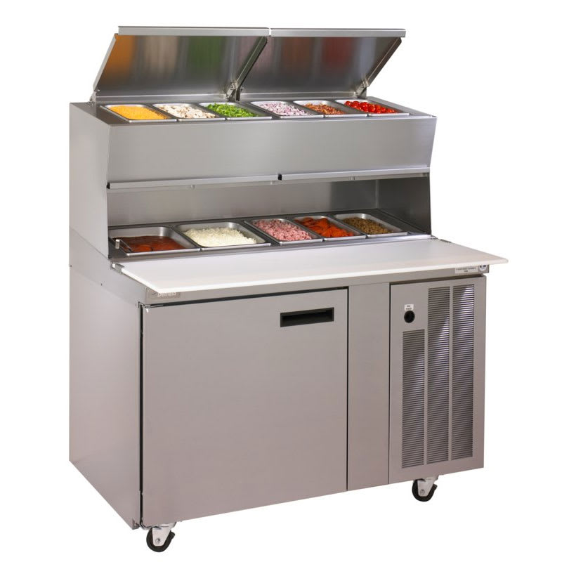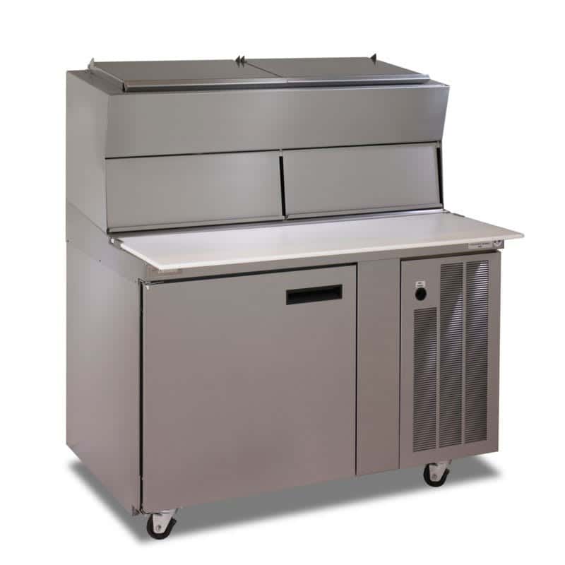 LiquiTec Refrigerated Pizza Table, single-section, 48″ W, (4) 12″ x 20″ pan capacity, (1) door, (1) 1/1 GN shelf, stainless steel removable hinged covers, 17″ polyurethane cutting board, flush mount LiquiTec raised rails, on/off switch, 18 gauge stainless steel top, stainless steel construction, 4″ casters, self-contained side-mounted refrigeration system, R290 Hydrocarbon refrigerant, 1/5 & 1/3 HP, cUL, UL, NSF
