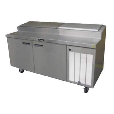 Refrigerated Pizza Table, two-section, 60″ W, 14.37 cubic feet, (7) 1/3 pan capacity, (2) shelves, (1) 27″ door & (1) 19″ door, 18 gauge stainless steel top, refrigerated pan rail, stainless steel ends, 6″ casters, side-mounted refrigeration system, R290 Hydrocarbon refrigerant, 1/4 HP, cUL, UL, NSF