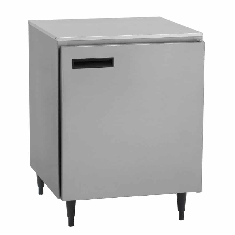 Undercounter Refrigerator, single-section, 27″ W, 5.7 cubic feet, (1) solid door, (1) epoxy coated wire shelf, stainless steel top, front & sides, black recessed handle, ABS interior, 6″ legs, rear-mounted refrigeration system, R290 Hydrocarbon refrigerant, 1/5 HP, NSF, cUL, UL, 115v/60/1ph