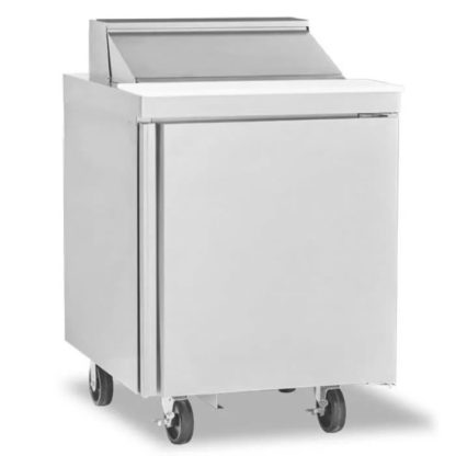 Sandwich/Salad Top Refrigerator, single-section, 27″ W, 8.2 cubic feet, (1) door, stainless steel top with polyethylene cutting board & (6) 1/6 size plastic pans, ABS interior sides, stainless steel front & sides, 5″ casters, front breathing rear-mounted refrigeration system, R290 Hydrocarbon refrigerant, 0.3 hp, cUL, UL, NSF