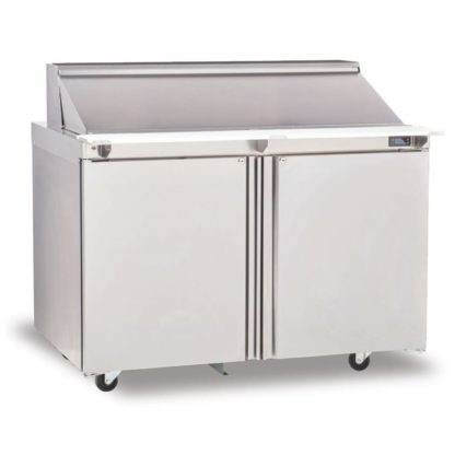 Sandwich/Salad Top Refrigerator, two-section, 48″ W, 16.0 cubic feet, (2) doors, stainless steel top with polyethylene cutting board & (6) 1/6 size plastic pans, ABS interior sides, stainless steel front & sides, 5″ casters, front-breathing rear-mounted refrigeration system, R290 Hydrocarbon refrigerant, 0.3 hp, cUL, UL, NSF