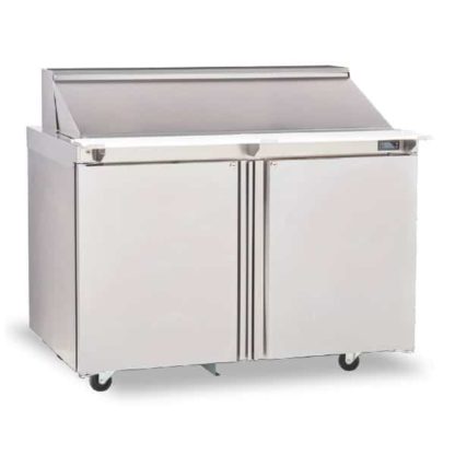 Mega Top Sandwich/Salad Top Refrigerator, two-section, 48″ W, 16.0 cubic feet, (2) doors, (2) 1/1 GN shelves, stainless steel top with polyethylene cutting board & (6) 1/6 size plastic pans, ABS interior sides, stainless steel front & sides, 5″ casters, front-breathing rear-mounted refrigeration system, R290 Hydrocarbon refrigerant, 0.3 hp, cUL, UL, NSF