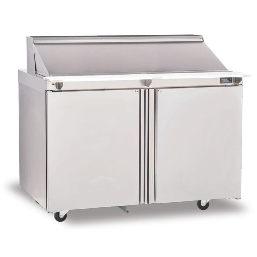 Sandwich/Salad Top Refrigerator, two-section, 48″ W, 16.0 cubic feet, (2) doors, stainless steel top with polyethylene cutting board & (8) 1/6 size plastic pans, ABS interior sides, stainless steel front & sides, 5″ casters, front-breathing rear-mounted refrigeration system, R290 Hydrocarbon refrigerant, 0.3 hp, cUL, UL, NSF