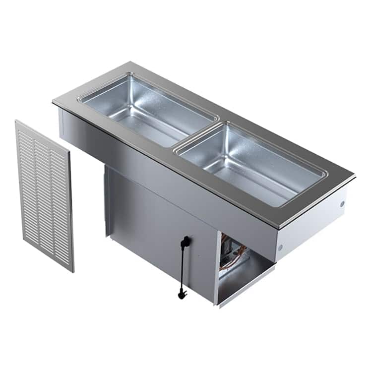 LiquiTec Slim Line Drop-In Cool Food Unit, 2-pan size, 4″ or 6″ deep pans flush with counter top, insulated pan, stainless steel inner liner & top, galvanized outer liner, self-contained Eutectic fluid refrigerated system, R404A refrigerant, 1/4 hp, (46-7/8″ x 17-1/4″ cutout required), cUL, UL, NSF
