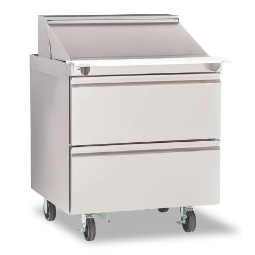 Mega Top Refrigerator, single-section, 27″ W, 8.20 cubic feet, (2) drawers, stainless steel top with polyethylene cutting board & (9) 1/6 size plastic pans, ABS interior sides, stainless steel front & sides, 5″ casters, front-breathing rear-mounted refrigeration system, R290 Hydrocarbon refrigerant, 0.3 hp, cUL, UL, NSF