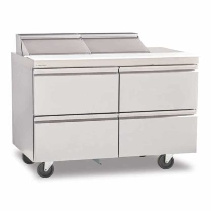 Mega Top Sandwich/Salad Top Refrigerator, two-section, 48″ W, 16.0 cubic feet, (4) drawers, stainless steel top with polyethylene cutting board & (12) 1/6 size plastic pans, ABS interior sides, stainless steel front & sides, 5″ casters, front-breathing rear-mounted refrigeration system, R290 Hydrocarbon refrigerant, 0.3 hp, cUL, UL, NSF