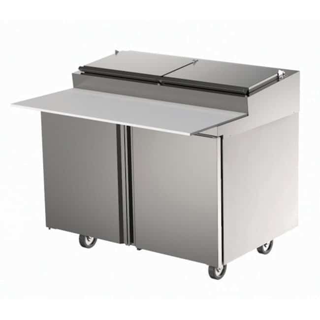 Raised Rail Sandwich/Salad Top Refrigerator, two-section, 72″ W, 27.80 cubic feet, stainless steel top with 17″ W polyethylene cutting board & (9) 1/3 size plastic pans, (4) drawers, stainless steel front & sides, ABS interior sides, 5″ casters; 2 locking, front-breathing rear-mounted refrigeration system, R290 Hydrocarbon refrigerant, 0.35 HP, cUL, UL, NSF