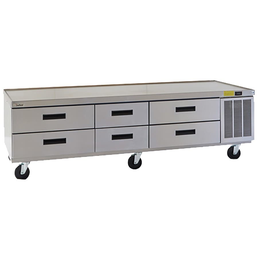 Refrigerated Low-Profile Equipment Stand, 96-1/4″W x 31-47/50″D x 24″H, three-section, (6) drawers (pans not included), marine edge stainless steel top & drawer fronts, front non-spill edge, ABS interior sides, 4″ casters, side-mounted refrigeration system with electric condensate evaporator, R290 Hydrocarbon refrigerant, 1/4 hp, cUL, UL, NSF, 115v/60/1ph