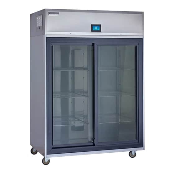 Specification Line Refrigerator, Reach-In, one-section, 21.0 cubic feet capacity, top-mounted self-contained refrigeration system, (2) half-height hinged glass doors (locking), (3) adjustable chrome wire shelves, 4.3″ easyTouch screen temperature display/control with remote monitoring, LED interior lighting, pilaster with shelf clips, stainless steel exterior front, sides & interior, (4) 5″ locking casters, GreenGenius R290 Hydrocarbon refrigerant, 0.22 HP, 115v/60/1-ph, 4.2 amps, NEMA 5-15P, NSF, cULus, ENERGY STAR