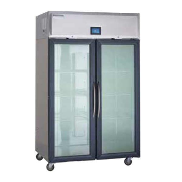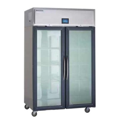 Specification Line Refrigerator, Reach-In, Narrow, two-section, 46.0 cubic feet capacity, top-mounted self-contained refrigeration system, (2) full-height hinged glass doors (locking), (6) adjustable chrome wire shelves, 4.3″ easyTouch screen temperature display/control with remote monitoring, LED interior lighting, pilaster with shelf clips, stainless steel exterior front, sides & interior, (4) 5″ locking casters, GreenGenius R290 Hydrocarbon refrigerant, 0.35 HP, 115v/60/1-ph, 6.0 amps, NEMA 5-15P, NSF, cULus, ENERGY STAR