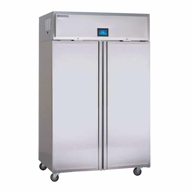 Specification Line Refrigerator, Reach-In, Narrow, two-section, 46.0 cubic feet capacity, top-mounted self-contained refrigeration system, (2) full-height hinged solid doors (locking), (6) adjustable chrome wire shelves, 4.3″ easyTouch screen temperature display/control with remote monitoring, LED interior lighting, stainless steel exterior front, sides & interior, (4) 5″ locking casters, GreenGenius R290 Hydrocarbon refrigerant, 0.35 HP, 115v/60/1-ph, 6.0 amps, NEMA 5-15P, NSF, cULus, ENERGY STAR