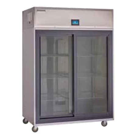 Specification Line Refrigerator, Reach-In, two-section, 46.0 cubic feet capacity, top-mounted self-contained refrigeration system, (2) full-height sliding glass doors (locking), (6) adjustable chrome wire shelves, 4.3″ easyTouch screen temperature display/control with remote monitoring, LED interior lighting, pilaster with shelf clips, stainless steel exterior front, sides & interior, (4) 5″ locking casters, GreenGenius R290 Hydrocarbon refrigerant, 0.35 HP, 115v/60/1-ph, 6.0 amps, NEMA 5-15P, NSF, cULus, ENERGY STAR