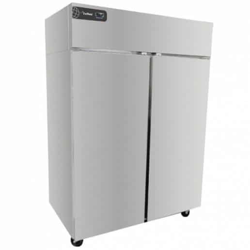 Specification Line Refrigerator, Reach-In, two-section, 46.0 cubic feet capacity, top-mounted self-contained refrigeration system, (2) full-height hinged solid doors (locking), (6) adjustable chrome wire shelves, 4.3″ easyTouch screen temperature display/control with remote monitoring, LED interior lighting, stainless steel exterior front, sides & interior, (4) 5″ locking casters, GreenGenius R290 Hydrocarbon refrigerant, 0.35 HP, 115v/60/1-ph, 6.0 amps, NEMA 5-15P, NSF, cULus, ENERGY STAR