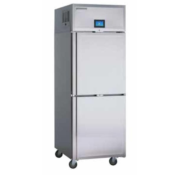Specification Line Refrigerator, Pass-Thru, one-section, 23.0 cubic feet capacity, top-mounted self-contained refrigeration system, (4) half-height hinged solid doors (locking), (3) adjustable chrome wire shelves, 4.3″ easyTouch screen temperature display/control with remote monitoring, LED interior lighting, stainless steel exterior front, sides & interior, (4) 5″ locking casters, GreenGenius R290 Hydrocarbon refrigerant, 0.22 HP, 115v/60/1-ph, 4.2 amps, NEMA 5-15P, NSF, cULus, ENERGY STAR