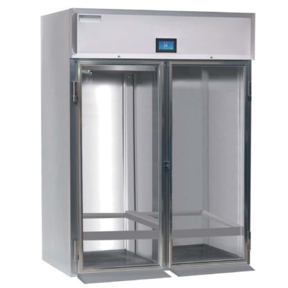 Specification Line Refrigerator, Roll-In, two-section, 76.5 cubic feet capacity, top-mounted self-contained refrigeration system, (2) full-height hinged glass doors (locking), 4.3″ easyTouch screen temperature display/control with remote monitoring, LED interior lighting, 1″ tall stainless steel ramp, pilaster with shelf clips, stainless steel exterior front, sides & interior, GreenGenius R290 Hydrocarbon refrigerant, 0.38 HP, 115v/60/1-ph, 6.5 amps, NEMA 5-15P, NSF, cULus, ENERGY STAR