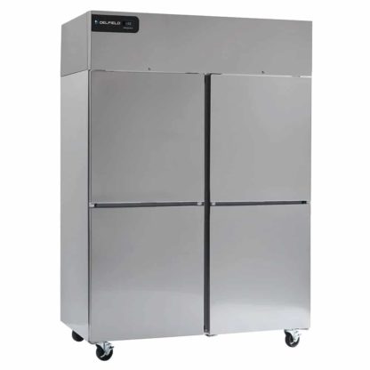 The top-mounted refrigeration system in this Delfield GBF2P-SH two-section reach-in freezer is positioned away from dirt and debris on the floor, which maximizes the food zone by keeping the components outside of it. Temperatures in the cabinet stay between -5 and 0 degrees Fahrenheit, depending on operators, who have control over the level on the digital system and display. If the temperature drops below or exceeds the safe range, visual alarms will alert the operator. The unit uses eco-friendly R290 hydrocarbon refrigerant, which is metered by a thermostatic expansion valve.