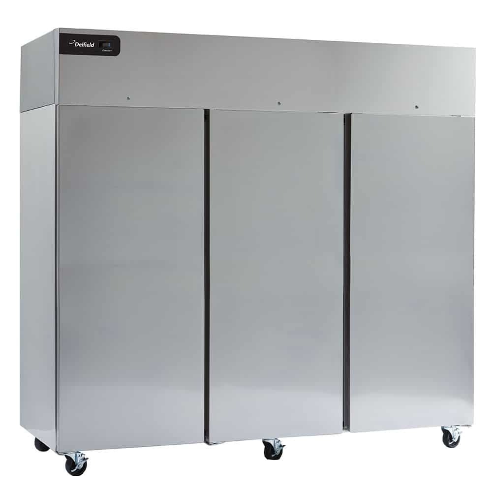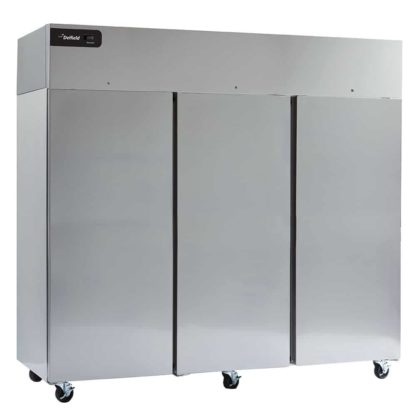 Coolscapes Reach-In Freezer, three-section, 83″ W, 71.0 cubic feet, self-contained refrigeration, (3) full height solid doors, LED interior lighting, digital temperature display/controls, (9) epoxy coated wire shelves, pilaster with shelf clips, stainless steel front & sides, aluminum back & interior, top mount refrigeration system, GreenGenius R290 Hydrocarbon refrigerant, 5″ casters, 115v/60/1-ph, 14.7 amps, (2) 1/2 HP, NEMA 5-20P, UL, NSF, ENERGY STAR