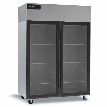 Offering 46 cubic feet of interior space, the Delfield GBR2P-G Coolscapes reach-in refrigerator is divided into two sections. Each of its six wire shelves are epoxy coated to defend against corrosion, while the interior is brightened with LED lighting to improve visibility. The two full-height glass doors offer a preview of the cabinet, and an external display provides a readout of the current temperature. Operators can make adjustments between 33 and 40 degrees Fahrenheit using digital controls, and to enable transportation between locations for service or cleaning, this unit is mounted on 5-inch casters.