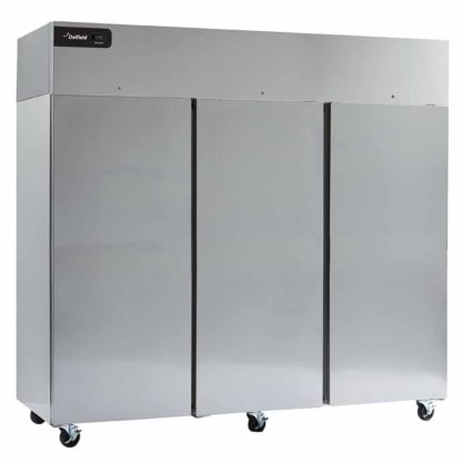 Coolscapes Reach-In Refrigerator, three-section, 83″ W, 71.0 cubic feet, self-contained refrigeration, (3) full height solid doors, LED interior lighting, digital temperature display/controls, (9) epoxy coated wire shelves, pilaster with shelf clips, stainless steel front & sides, aluminum back & interior, top mount refrigeration system, GreenGenius R290 Hydrocarbon refrigerant, 5″ casters, 115v/60/1-ph, 6.5 amps, 1/3 HP, NEMA 5-15P, UL, NSF, ENERGY STAR
