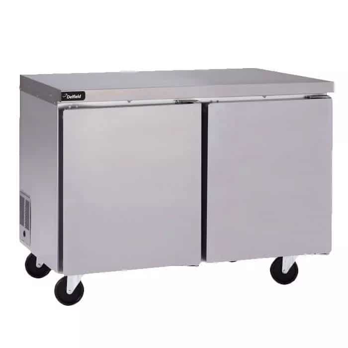 Depending on the application, the temperature in this Delfield GUF32P-S one-section undercounter freezer can be set between -5 and 0 degrees Fahrenheit on the electronic controller. Reducing compressor cycling to lengthen component lifespan and save energy, the control system cuts pull-down times after loading. So clearances at the top and sides are not required, the refrigeration system is rear mounted and has a front-breathing design.