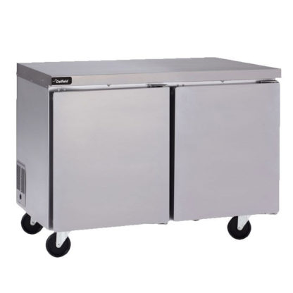 Enabling operators to set the temperature at a level between -5 and 0 degrees Fahrenheit, this Delfield GUF48P-S two-section undercounter freezer has an electronic control system. With this system, the freezer has efficient pull-down times that reduce compressor cycling, which increases the compressor’s lifespan and conserves energy. The refrigeration system is rear mounted, and because it breathes from the front, it doesn’t need side or top clearances.