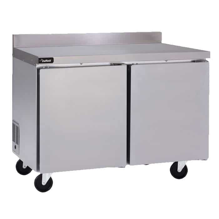 The front and top of the Delfield GUF60BP-S worktop freezer are made of stainless steel-a rust- and scratch-resistant metal that’s well suited to heavy use. Its top is equipped with a 4-inch backsplash to help keep messes contained, and it’s mounted on casters to enable mobility. This unit’s temperature can be adjusted between -5 and 0 degrees Fahrenheit and monitored on an exterior digital readout. Overall, it measures 60 inches wide by 31.59 inches deep by 36 inches high.