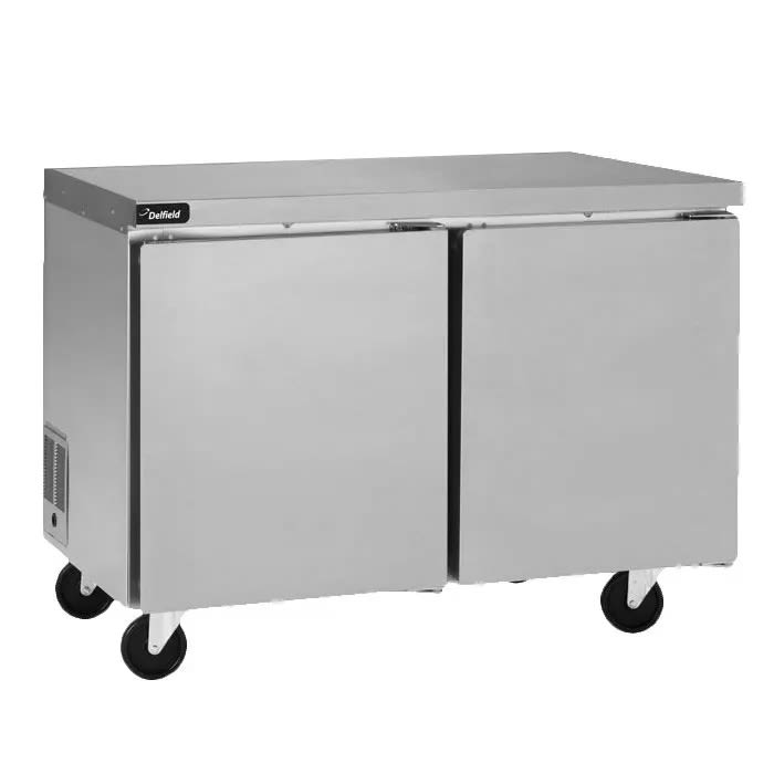 The Delfield GUF60P-S Coolscapes two-section undercounter freezer offers cold storage space under existing countertops without taking up valuable equipment and prep space. It has a large, 60-inch width with two sections, each with a corrosion-resistant, epoxy-coated shelf. The cabinet has two solid doors that can be reversed in the field to fit into different kitchen layouts. These doors have smart hinges that self-close and stay open, while handles are built into the doors.
