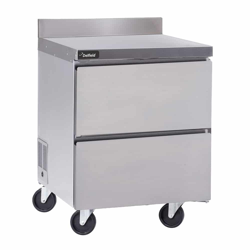Coolscapes Worktable Refrigerator, one-section, 27″ W, 4.8 cubic feet, (2) drawers, holds (12) 1/6 size pans 6″ deep, 4″ backsplash, stainless steel top and front, aluminum sides, galvanized back and bottom, gray coated aluminum interior sides & anodized aluminum bottom, 5″ casters (2 locking, 2 non-locking), rear-mounted refrigeration system, R290 Hydrocarbon refrigerant, 115v/60/1, 3.2 amps, 8′ cord, NEMA 5-15P, 1/5 HP, UL, cUL, NSF