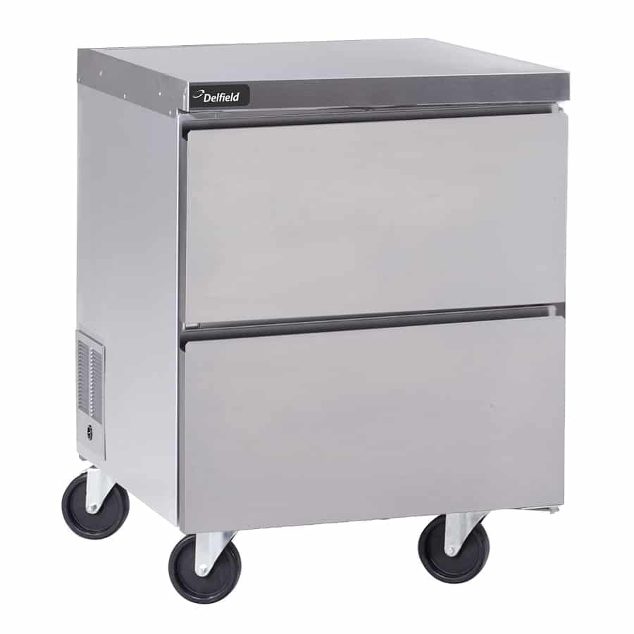Using electronic controls, operators can adjust the temperature in the Delfield GUR27P-D one-section undercounter refrigerator from 33 to 40 degrees Fahrenheit. With its stainless steel construction, the top is sturdy enough to prepare food and hold equipment, and the sides and bottom are made of durable anodized aluminum. To relocate this unit elsewhere in the kitchen, it can be rolled on its 5-inch casters-two of these casters lock to hold the refrigerator in place when it’s done moving.