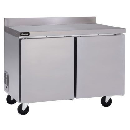 Coolscapes Worktable Refrigerator, two-section, 48″ W, 12.5 cubic feet, (2) stainless steel doors, (2) gray epoxy coated shelves, 4″ backsplash, stainless steel top and front, aluminum sides, galvanized back and bottom, gray coated aluminum interior sides & anodized aluminum bottom, 5″ casters (2 locking, 2 non-locking), rear-mounted refrigeration system, R290 Hydrocarbon refrigerant, 115v/60/1, 3.2 amps, 8′ cord, NEMA 5-15P, 1/5 HP, UL, cUL, NSF