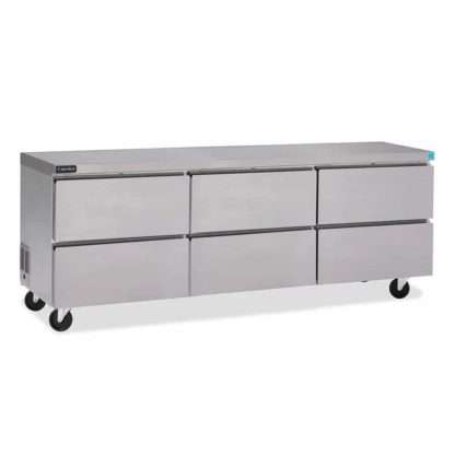 Coolscapes Undercounter/Worktable Refrigerator, three-section, 72″ W, 14.2 cubic feet, (6) drawers, holds (24) 1/6 size pans 6″ deep, stainless steel top and front, aluminum sides, galvanized back and bottom, gray coated aluminum interior sides & anodized aluminum bottom, 5″ casters (2 locking, 2 non-locking), rear-mounted refrigeration system, R290 Hydrocarbon refrigerant, 115v/60/1, 3.2 amps, 8′ cord, NEMA 5-15P, 1/5 HP, UL, cUL, NSF