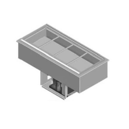 Drop-In Mechanically Cooled Pan, forced air, 4-pan size, accommodates 4″ deep pans, insulated pan, stainless steel inner liner & top, galvanized steel outer liner, includes adapter bars, self-contained refrigeration, R290 refrigerant, 1/2 hp, (55-3/4″ x 25-1/2″ cutout required), cUL, UL, NSF, 115v/60/1ph