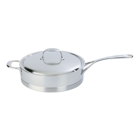 The straight sided pans boast a 7-layer base, InductoSeal, whose copper disk ensures impressive heat conduction. Proprietary technology ensures the base stays flat even when heated. The patented Silvinox surface treatment maintains the beautiful silvery white matte appearance. Enjoy easy maneuverability with the stay-cool, welded handles while the rolled rims encourage dripless pouring.
