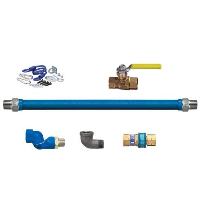 Dormont Blue Hose Moveable Gas Connector Kit, 3/4″ inside dia., 36″ long, covered with stainless steel braid, coated with blue antimicrobial PVC, (1) SnapFast QD, (1) Swivel MAX, (1) full port valve, (1) elbow, (1) Snap’N Go, coiled restraining cable with hardware, 203,000 BTU/hr minimum flow capacity, limited lifetime warranty