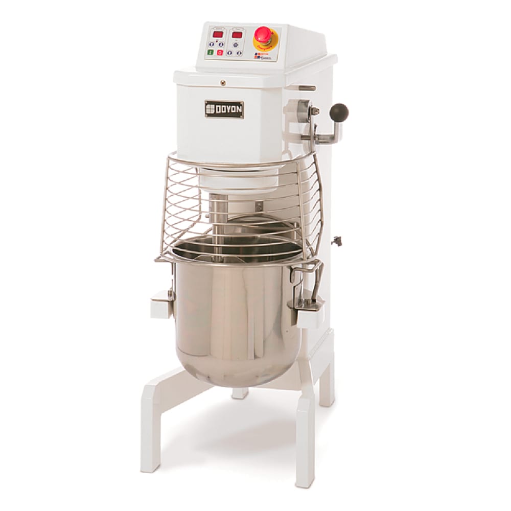 The Doyon BTF010 planetary mixer has 20 speeds that can be changed during operation. Popular recipes can be prepared with the seven programmable speed and time settings. Its stainless steel bowl, whip, dough hook, and flat beater resist chips, dents, and scratches. It has a stainless steel wire bowl safety guard that keeps dough and batter contained. The steel frame is sturdy and has an enamel finish designed for efficient cleaning. The Doyon BTF010 planetary mixer has a heavy-duty motor that resists overloading and belt slippage.