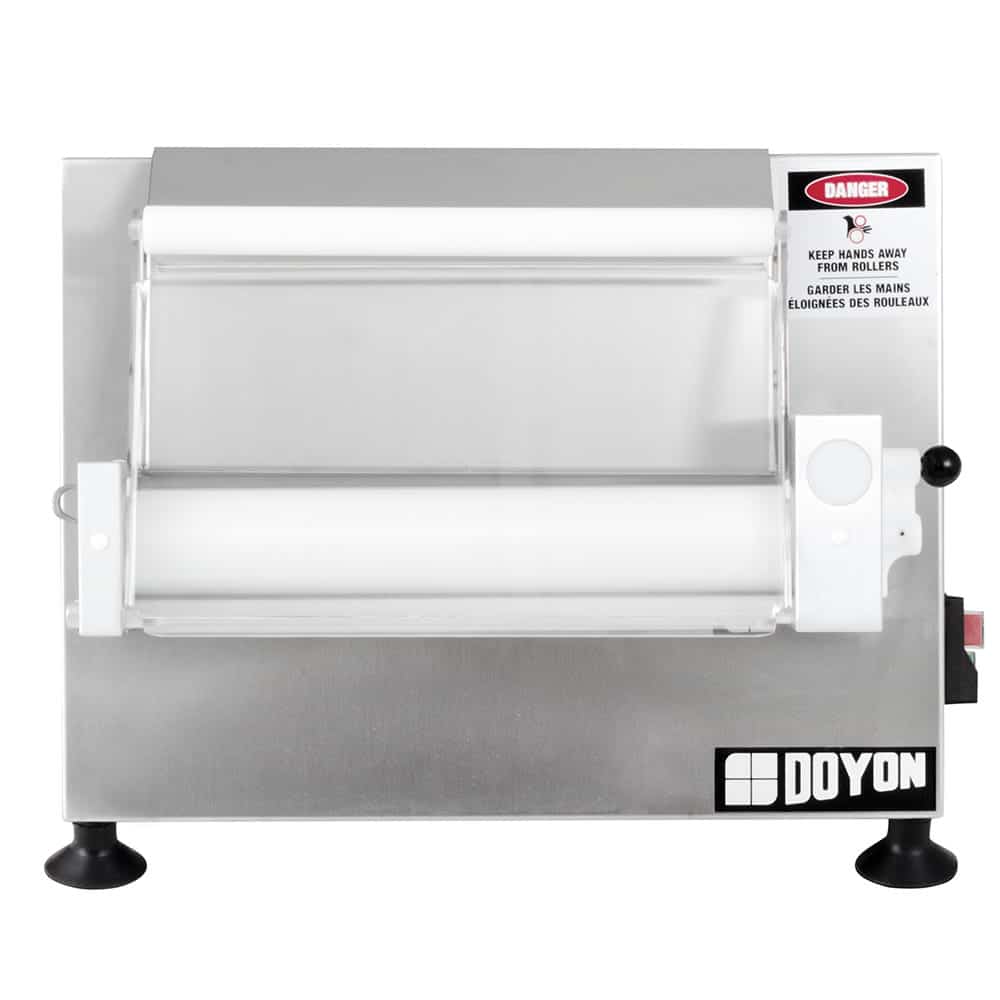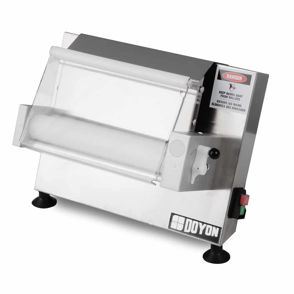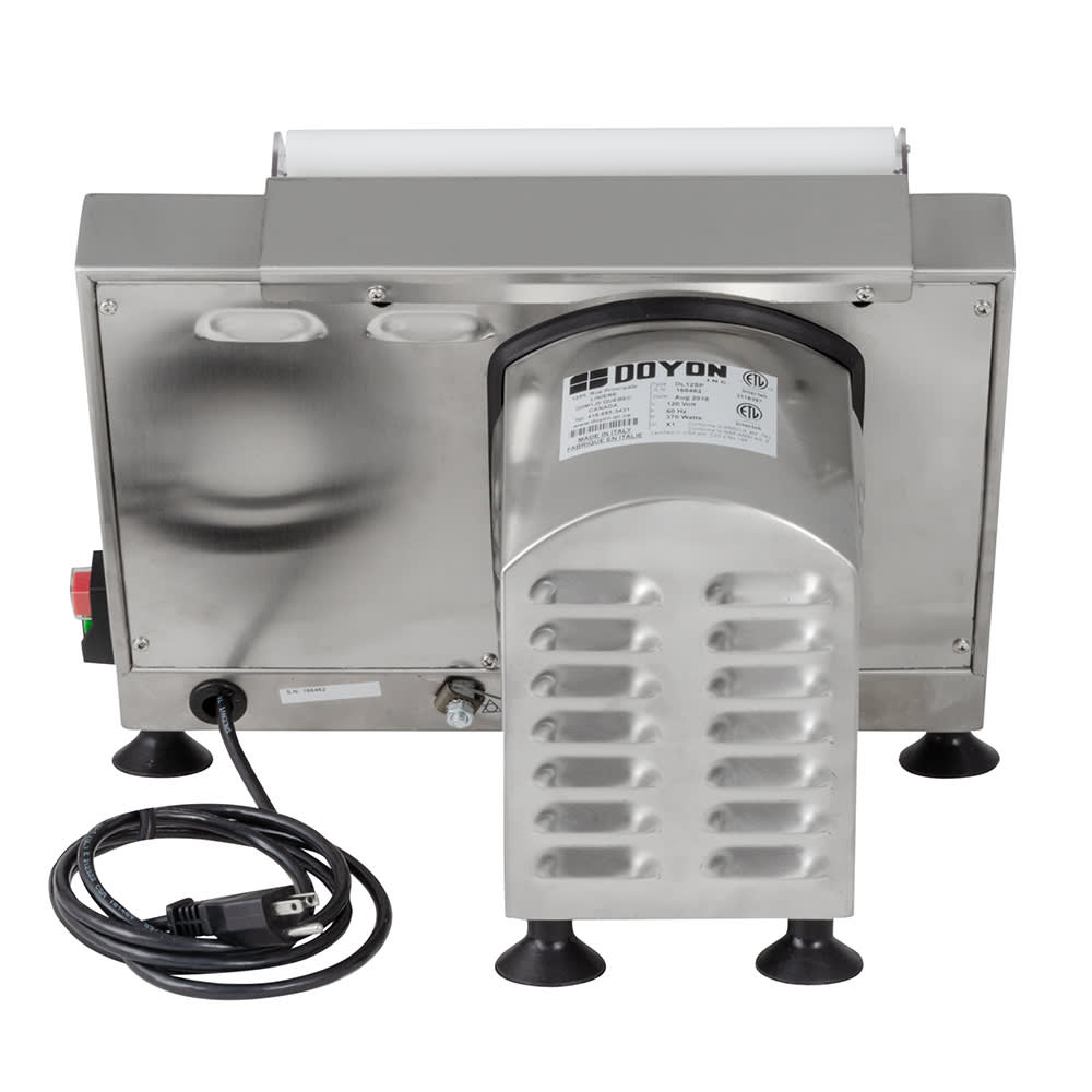 The Doyon DL12SP dough sheeter can make 250 sheets of dough in one hour that measure up to 12 inches in diameter with 12-inch-by-2-inch rollers. These rollers are made of plastic to resist corrosion and are designed to eliminate dough buildup. The gap in the rollers can be adjusted with a maximum gap of 13/64 inch. Since this unit is made of stainless steel, it is heavy duty and easy to clean. It can be operated from the front or side, fitting into different kitchen workflows. The Doyon DL12SP dough sheeter has an ergonomic design that reduces the need for a rolling pin to minimize back strain.