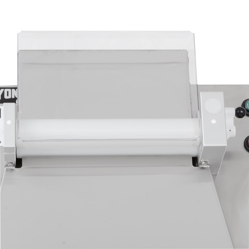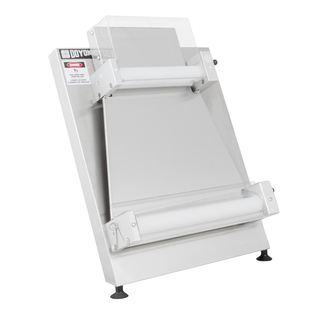 The Doyon DL18P dough sheeter uses two sets of plastic rollers to create 250 sheets of dough with a maximum 17-inch diameter. The gap between the rollers can be adjusted with the quick change index system, enabling the dough thickness to be changed up to 13/64 inch. This stainless steel unit has spring-loaded scrapers that are removable to facilitate cleaning, and with this heavy-duty Doyon DL18P dough sheeter, rolling pins are virtually eliminated to reduce back strain while providing more consistent dough sheets.