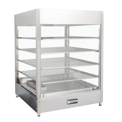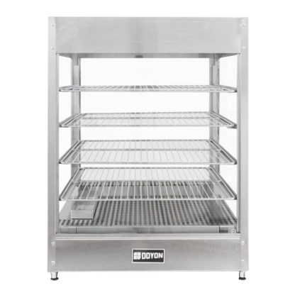 The Doyon DRP4S pizza display case has a glass panel in each side that reveals the product inside, encouraging impulse buys. Each of its four shelving levels is separated by four inches of clearance. Its glass side panels can be removed for thorough cleaning, and the stainless steel frame resists damage from rust and scratches. Food is kept hot by a temperature control with a 175-degree-Fahrenheit limit while an internal water pan releases steam to prevent products from drying out. This unit can hold (4) 20-inch pizzas, (16) 9-inch pizzas, or 16 chickens.