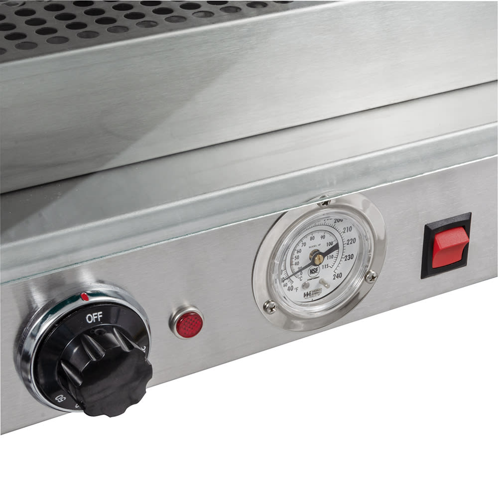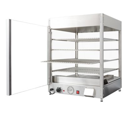 Food Warmer/Display Case, counter model, with four shelf interior rack, capacity (4) 20″ diameter pizzas, inside water pan for humidity, adjustable heat control, tempered glass front, sides & doors, no top or logo, stainless steel interior & exterior, 120v/60/1, 11amps