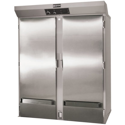 The Doyon E236R roll-in proofer holds two single racks. Bright lights illuminate the product for visibility through the transparent doors. Water automatically enters the unit so a drain is not required. Humidity stays at 95 percent and the temperature range is from 90 to 110 degrees Fahrenheit. Both heat and humidity are evenly distributed by the heating system. The electronic display includes a countdown timer and the controls for the temperature and humidity. This proofing cabinet is constructed of stainless steel to resist corrosion.